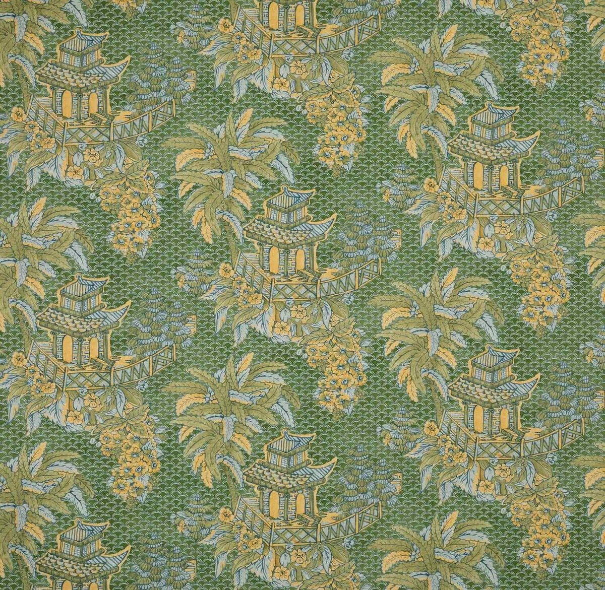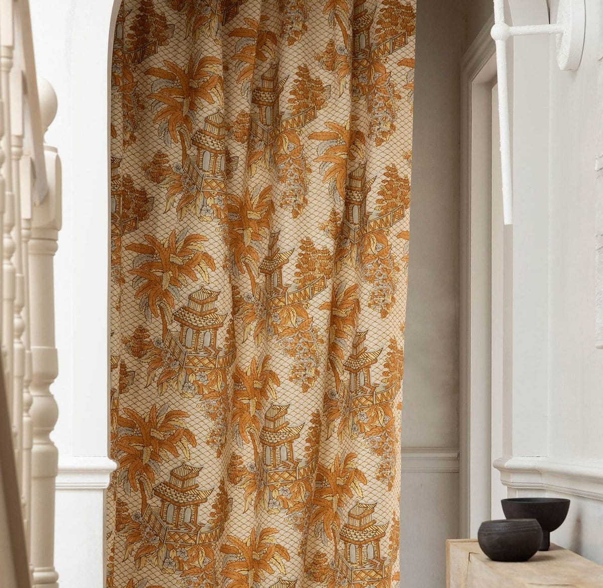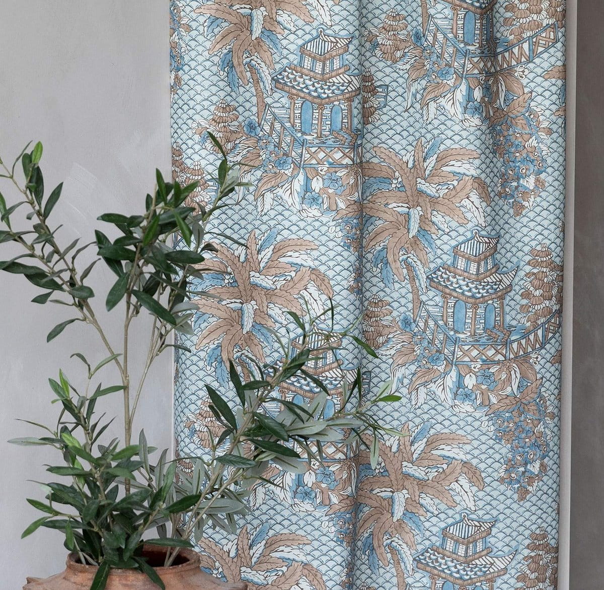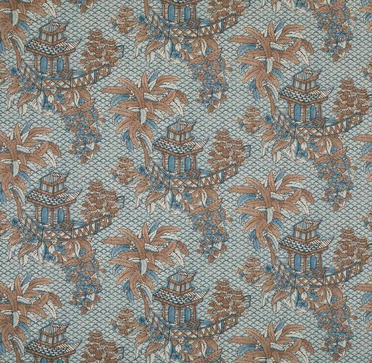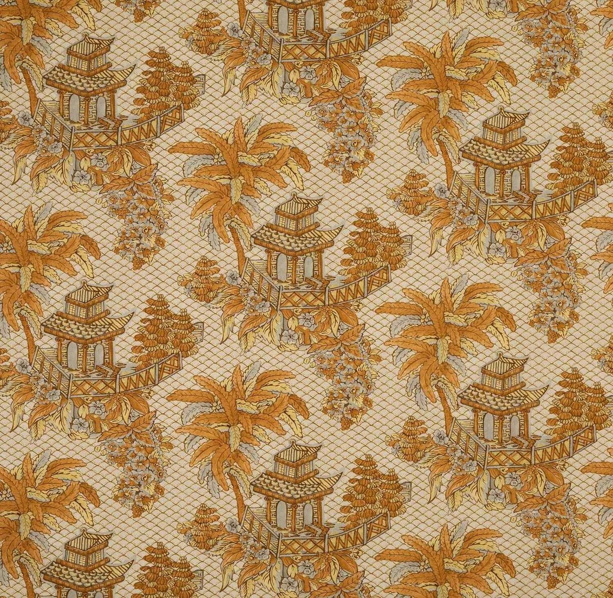 Mandalay by Marvic is a high-end furnishing fabric in linen and cotton, a modern reinterpretation of a French archival print. Its large-scale design of pagodas beneath palm trees brings character and exoticism to any interior. Available in three colourways, it is ideal for creating curtains, cushions, or refined upholstery.