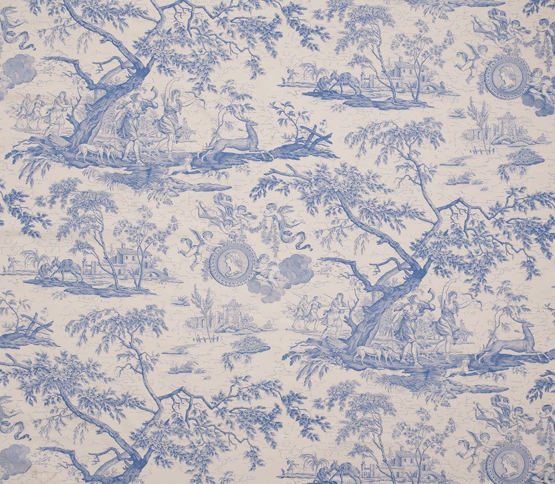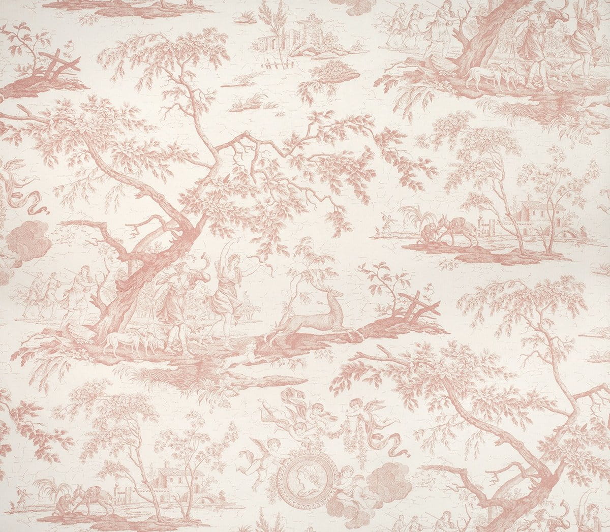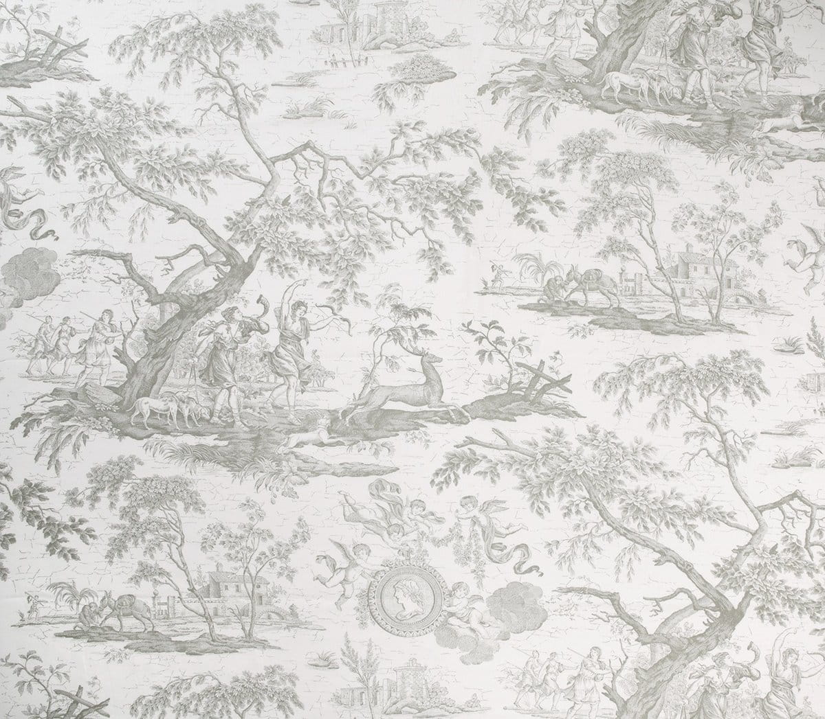 La Chasse is a Marvic Textiles toile featuring a finely detailed neoclassical print. Majestic trees and hunting scenes create an elegant decorative composition. Suitable for curtains or wall coverings, this design is available in 100% cotton or 100% linen, and is also offered as a wallpaper.