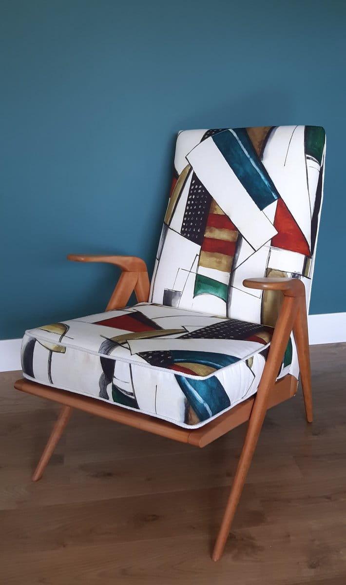 Kasimir is a cubist drawing in the spirit of Malevitch. A successful combination of simple geometric shapes and strongly pigmented colours. It is printed on beautiful, washed linen which gives depth to the drawing and ensures a beautiful curtain fall and a good. fit in the chairs.
