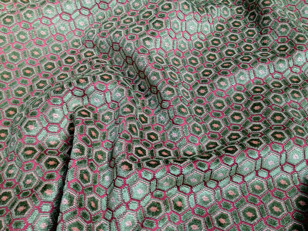 Velvet with a small Louis XVI - Directoire pattern, woven using the loop-cut velvet technique. This type of velvet is perfect for covering seats or making cushions. Over time, the crushing of the pile due to the successive seating can give a shimmering effect which will give a natural patina over time.