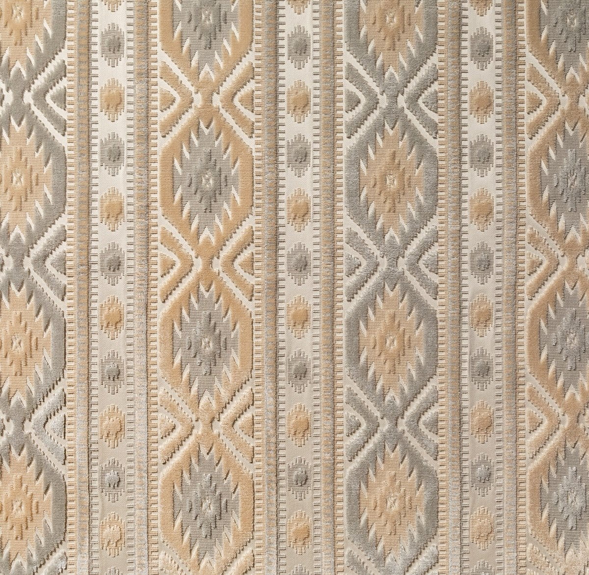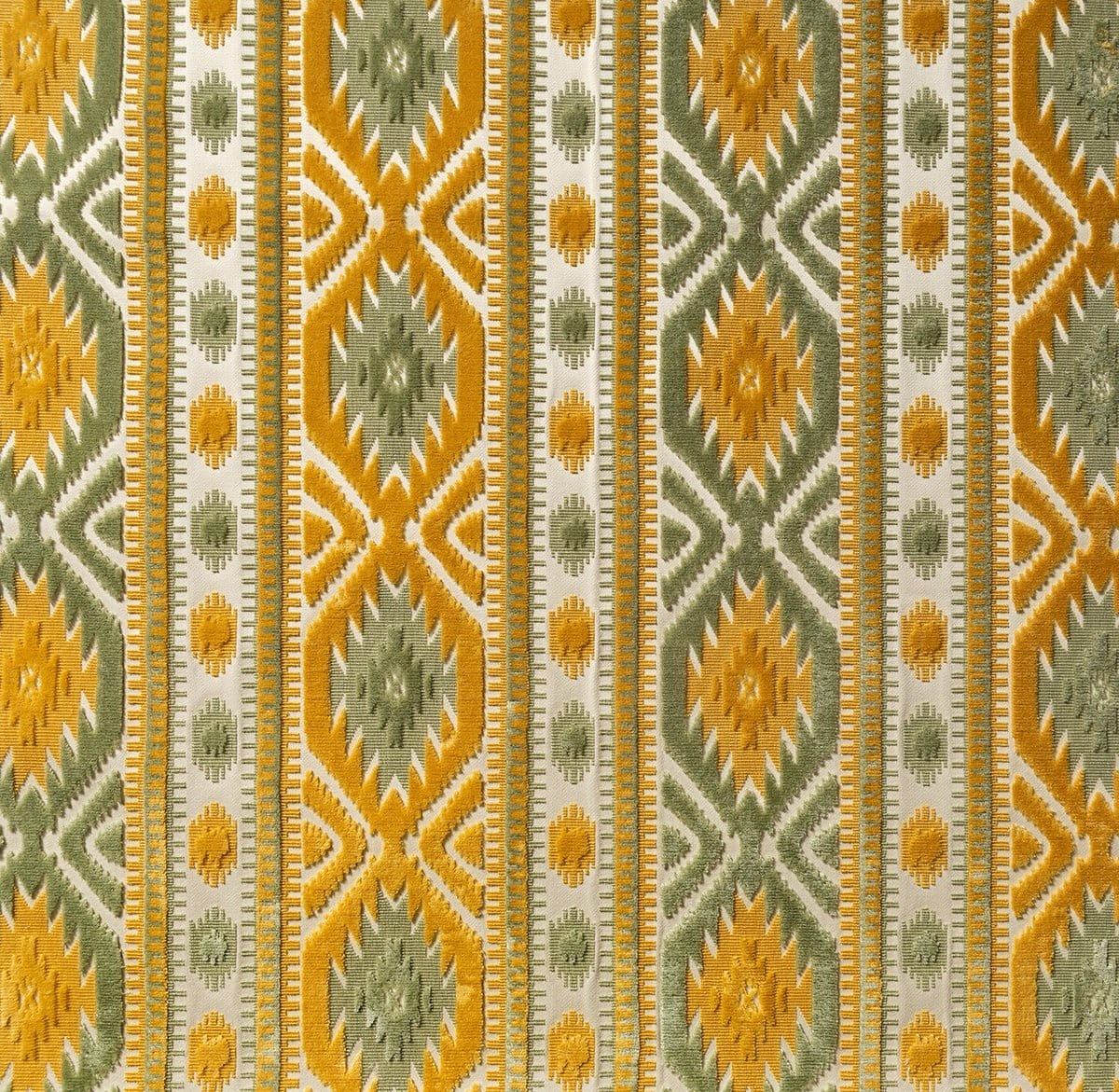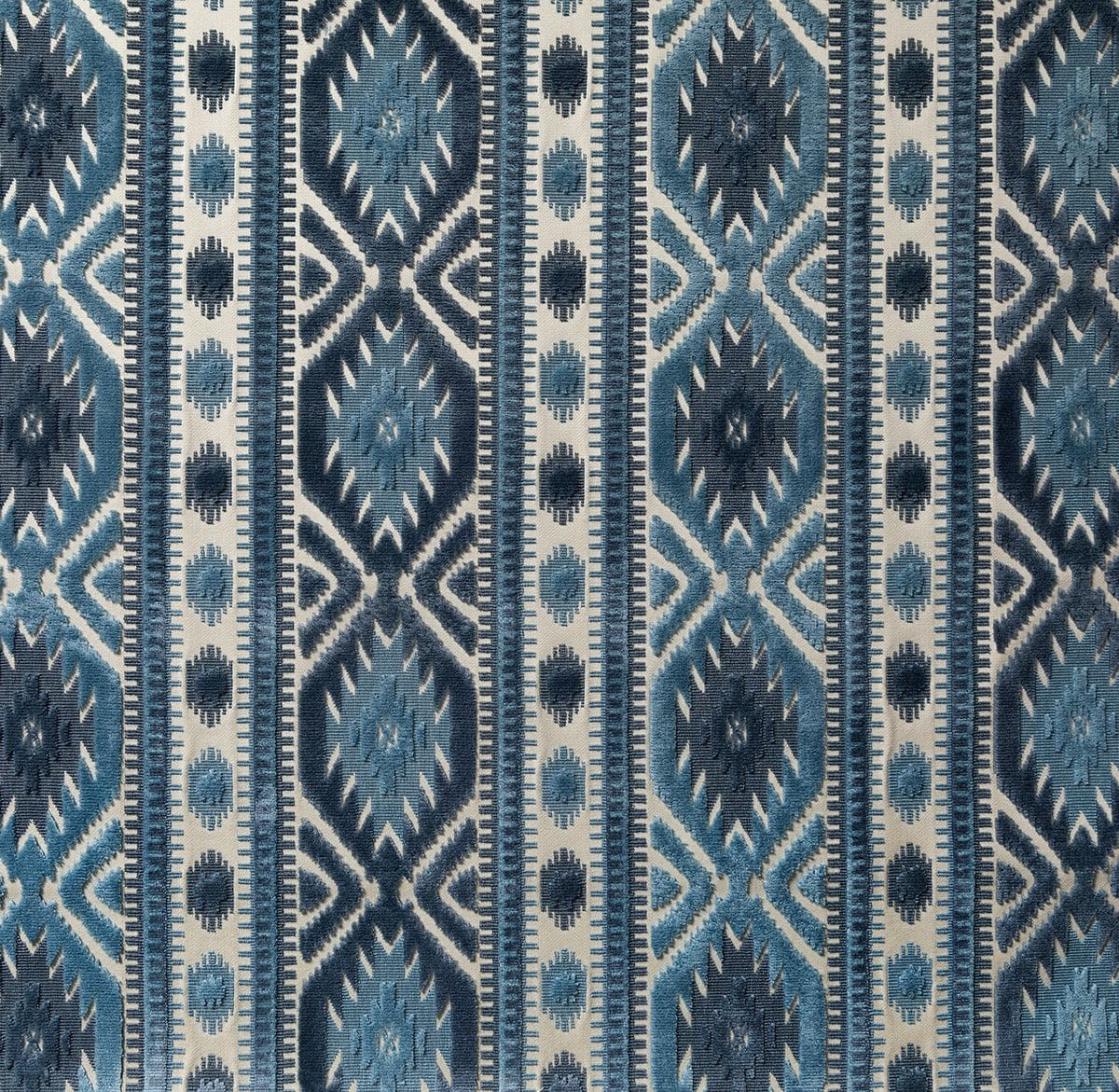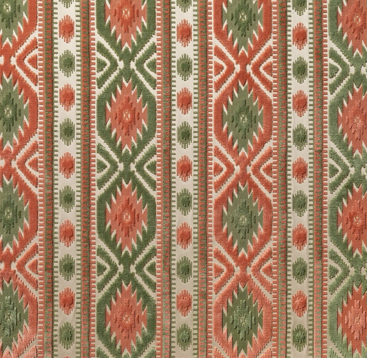 Tissu d'ameublement haut de gamme, Le Kilim de Marvic est un velours de coton coupé/non coupé inspiré des médaillons géométriques des tapis kilim. Motif à rayures verticales de taille moyenne, le dessin, net et charismatique, structure l'espace et magnifie les assises. Travail artisanal, belle main.