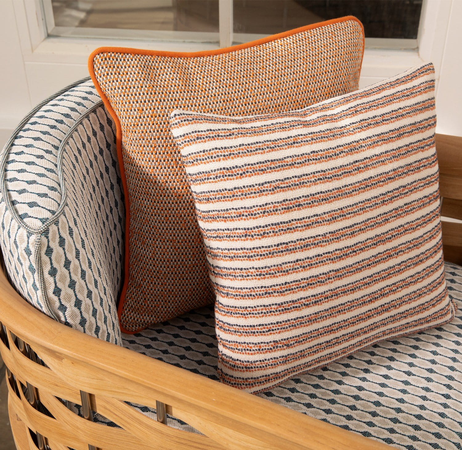 Sunset est un tissu indoor/outdoor. Sa fine rayure horizontale à petite échelle révèle une texture naturelle, animée par de délicats fils bouclés contrastés. Confectionné en fils acryliques teints masse haute performance, Sunset offre une résistance exceptionnelle à la lumière, aux UV, à l'eau et aux taches, sans traitement chimique.