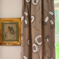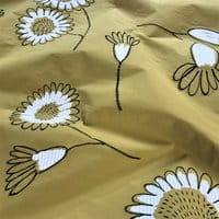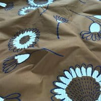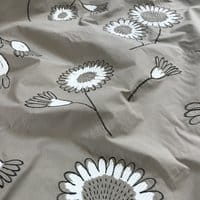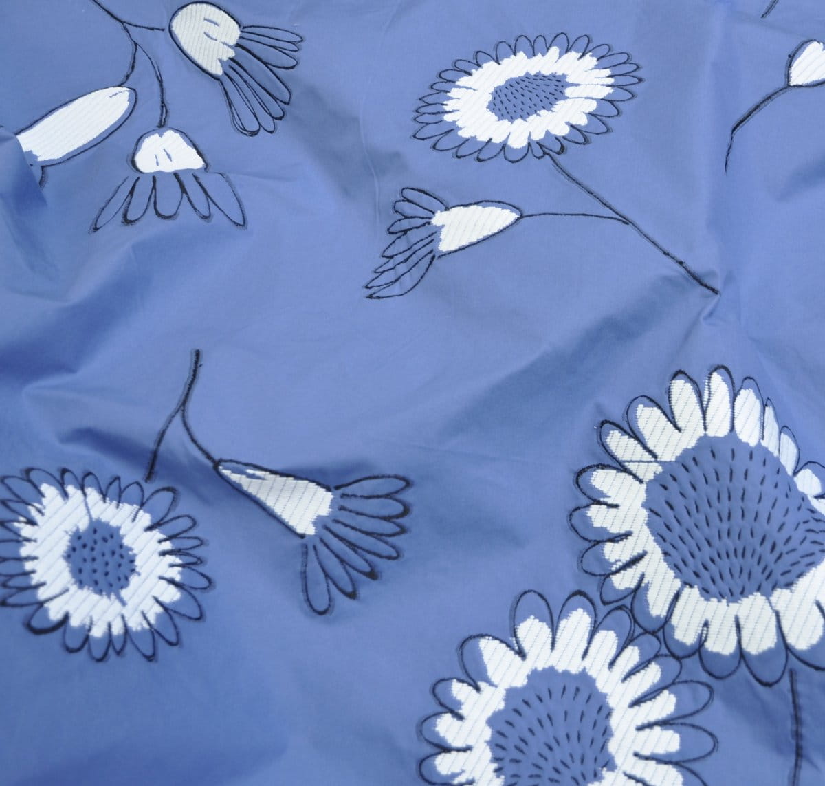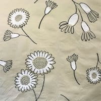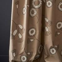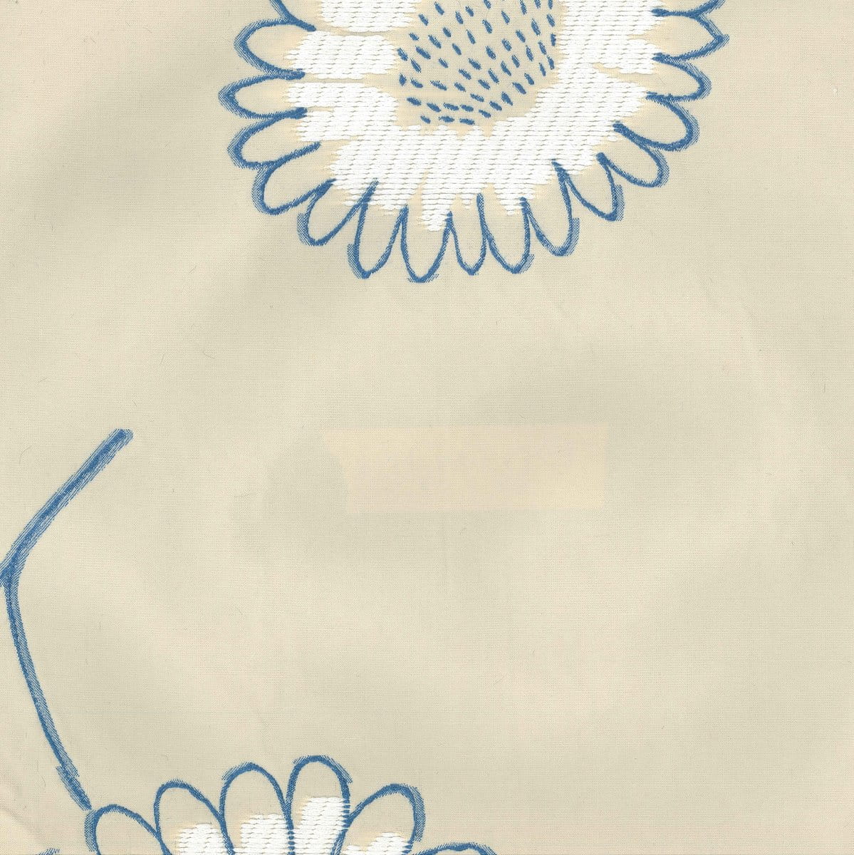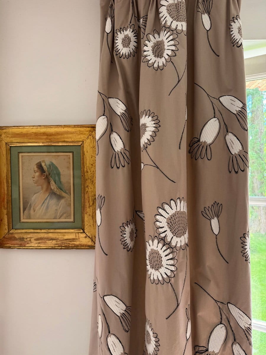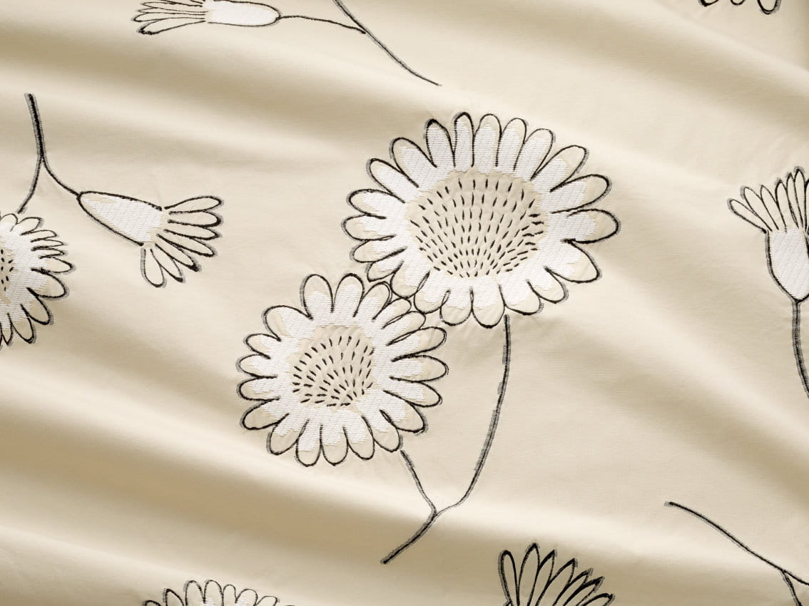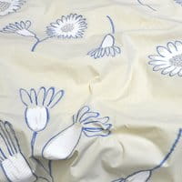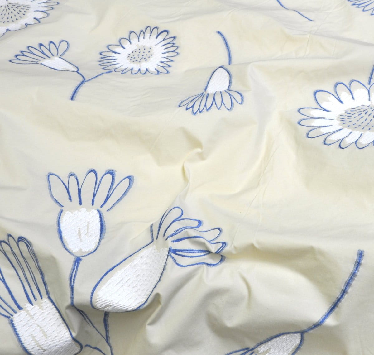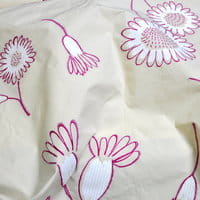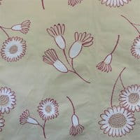 Ce dessin m'évoquant un peu l'esprit Cocteau, je l'ai appelé Colette, en souvenir de cet esprit des années 50' qui planait sur le Palais-Royal. Le dessin naïf et bien équilibré est traité sous forme de broderie sur un fond de coton d'une main exceptionnelle. Ce tissu est traité dans une gamme de sept coloris ; des coloris naturels (fonds blancs ou beiges), mais aussi des coloris utilisant des fonds plus forts (bleu, chocolat, safran) apportant une note très déco à cette étoffe. Le contrefond des dessins Frida et Colette est disponible sous la référence "Voile de Felouque".