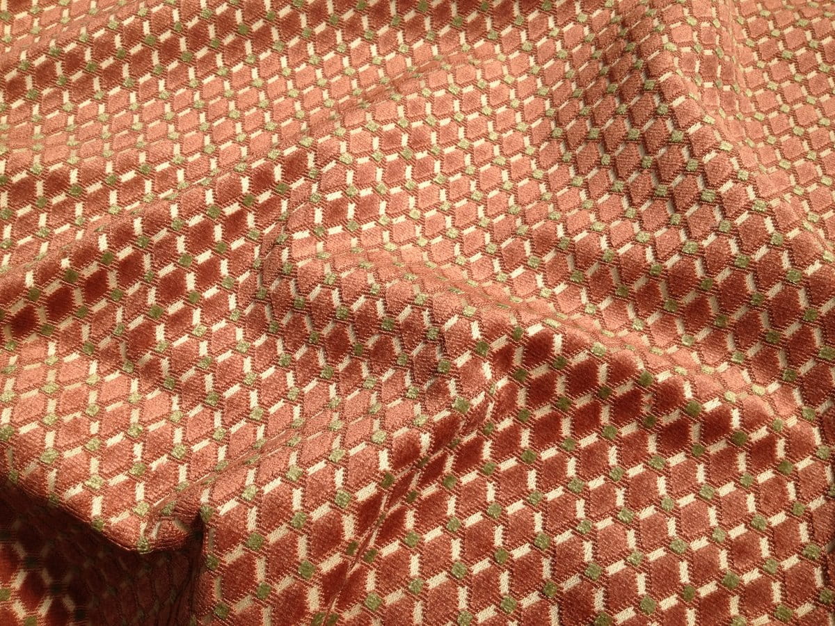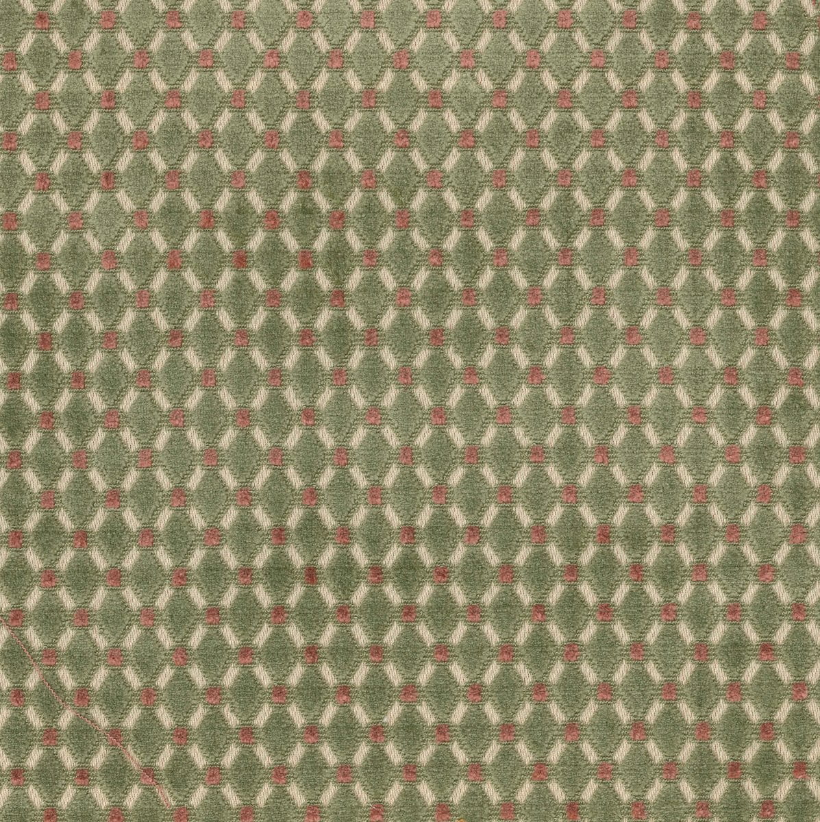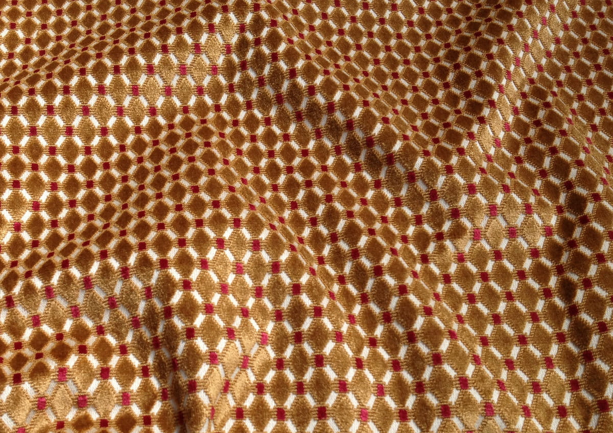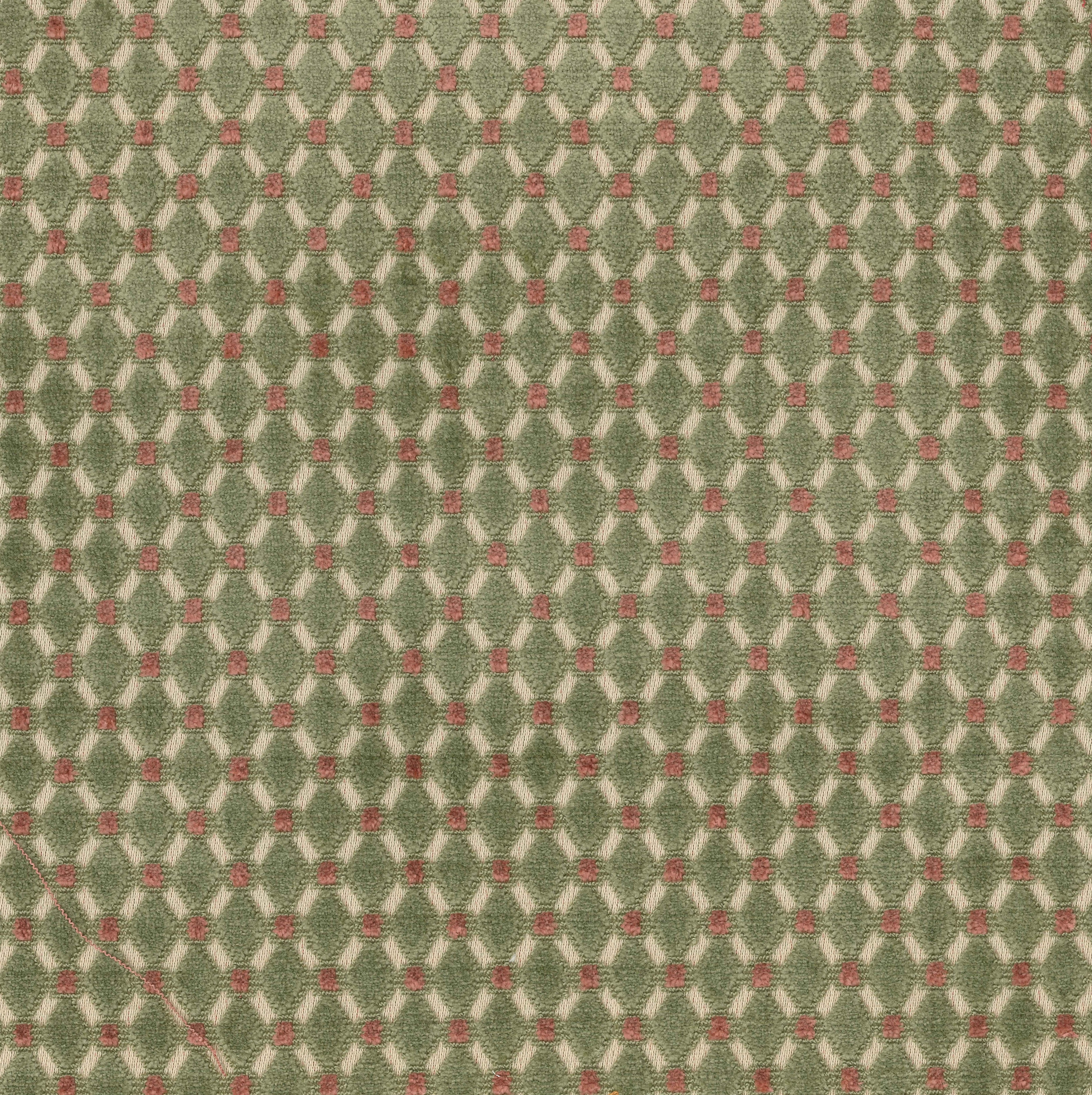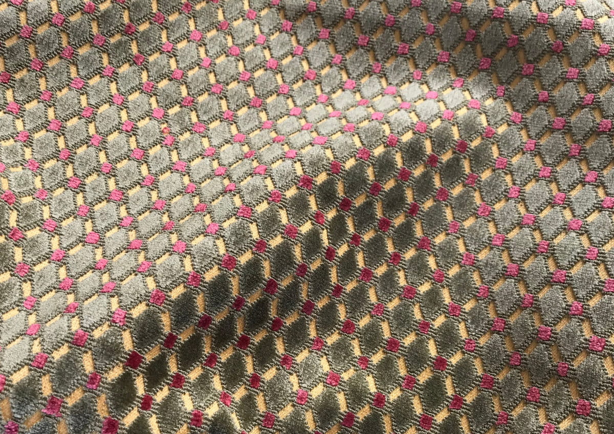 Velours de gênes à petit motif Louis XVI - Directoire, tissé selon la technique des velours bouclé-coupé. Ce type de velours est parfait pour la couverture de sièges ou la confection de coussins. Dans le temps l'écrasement du poil suite aux assises successives peut présenter des miroitements qui donneront au fil du temps une patine naturelle.